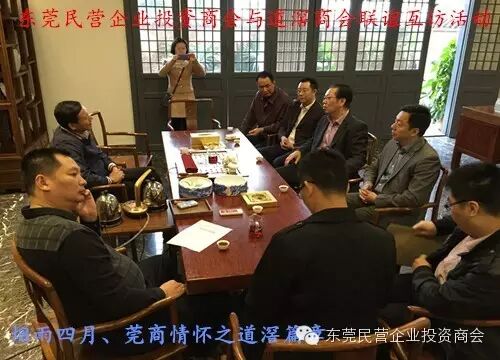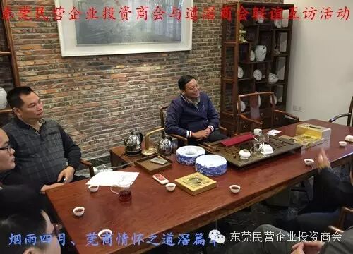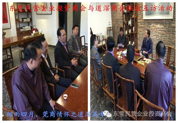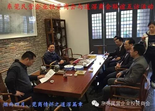 此次互访活动由市工商联搭建平台作为各商协会的桥梁纽带,旨在加强各商协会间的互动交流、通过资源共享、携手进步,共同发展!商会与商会间进行了各地文化与项目的深度交流。陈灿强会长对商会大体工作及投资公司运营项目作了概括性的介绍,着重探讨了商会将于5月22日-24日在厚街举办的东莞民营企业产品博览会暨项目投资对接会,本次博览会将会把东莞制造业与终端客户的联系推向新的高度;将把东莞民营企业的优质产品及项目推向全国、推向全世界;不光是东莞市工商联、厚街相关政府部门等的高度重视,同时也得到道滘商会叶建勋会长、陈锡坤理事监副秘书长等会员的大力支持及高度赞扬!叶建勋会长表示道滘商会将全力支持东莞民营企业投投资商会的“博览会”,本次博览会是一个窗口,是搭建商会及会员企业与社会各界交流的平台,把商会及会员企业生产经营的特色产品宣传出去,推介出去;道滘商会将全力动员会员参展,凡参展的会员商会将补贴一半的展位费,在支持博览会的同时又为道滘商会会员提供福利!道滘商会此举可谓壮志豪情!前所未有!此情意令东莞民营企业投资商会一行人动容,很感动!
