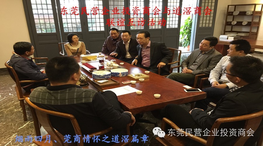 2015年4月10日上午,经由市工商联组织,市工商联总商会叶柱波主任兼秘书长、工商联刘惠强部长、王励吾前辈、东莞民营企业投资商会陈灿强会长、韦会才常务副会长、张摊明常务副会长、刘海波副秘书长一行驱车抵达道滘商会大厦参观访问,道滘商会叶建勋会长、陈锡坤理事兼副秘书长、卢耀华办公室主任、叶碧银副主任等热情接待,一起围席品茗,共叙商情!